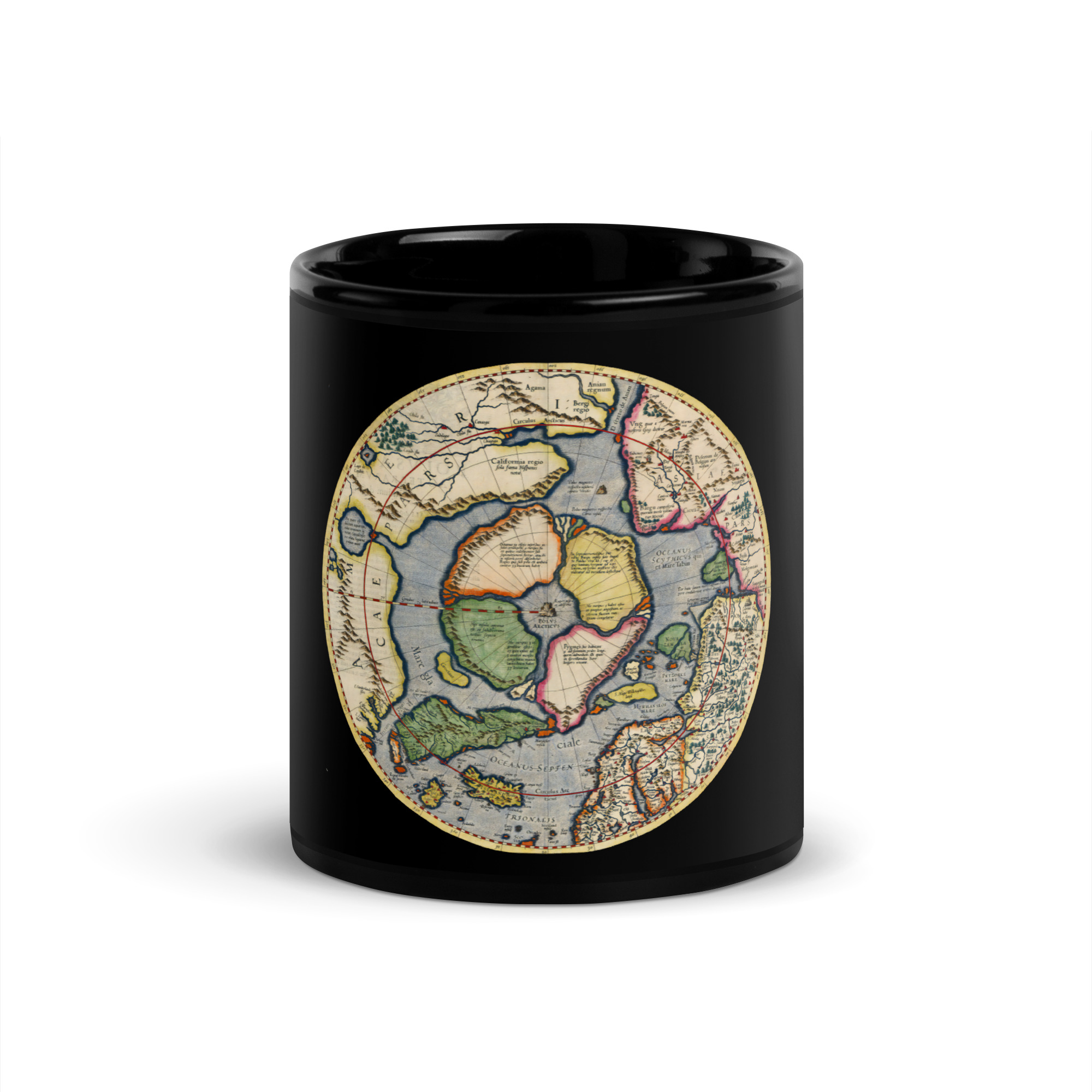 Start your day with more than just coffee — start it with curiosity. This black glossy coffee mug features the stunning and mysterious 1606 Mercator-Hondius map, a beautifully detailed depiction of the world before modern cartography took over.